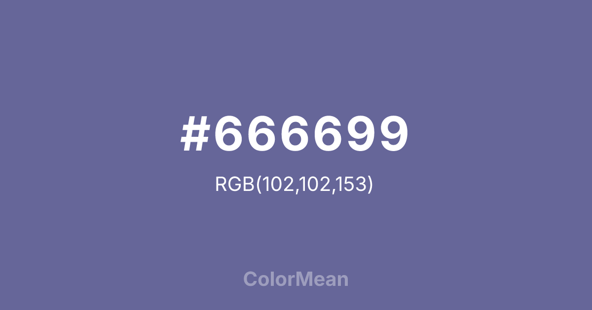 Dark Blue-gray (#666699) RGB value is (102, 102, 153). The hex color red value is 102, green is 102, and blue is 153. Its HSL format shows a hue of 240°, saturation of 20%, and lightness of 50%. The CMYK process values are 33%, 33%, 0%, 40%.