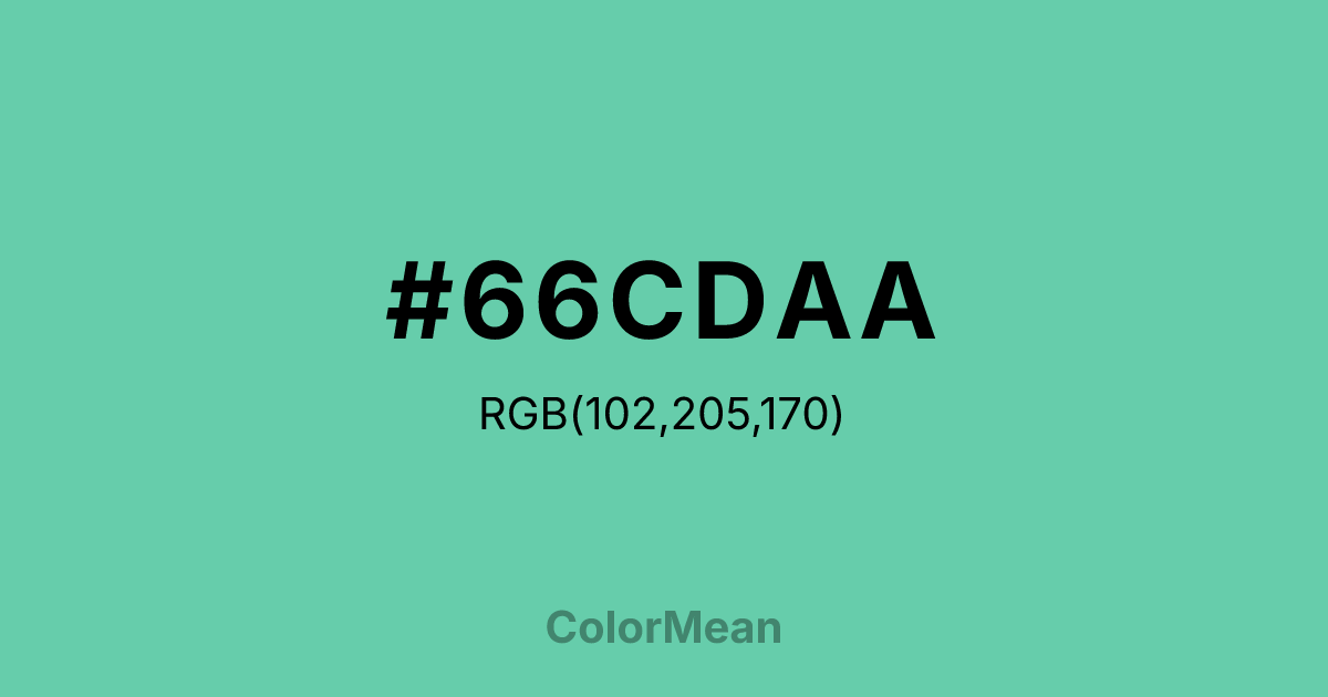 Medium (#66CDAA) RGB value is (102, 205, 170). The hex color red value is 102, green is 205, and blue is 170. Its HSL format shows a hue of 160°, saturation of 51%, and lightness of 60%. The CMYK process values are 50%, 0%, 17%, 20%.
