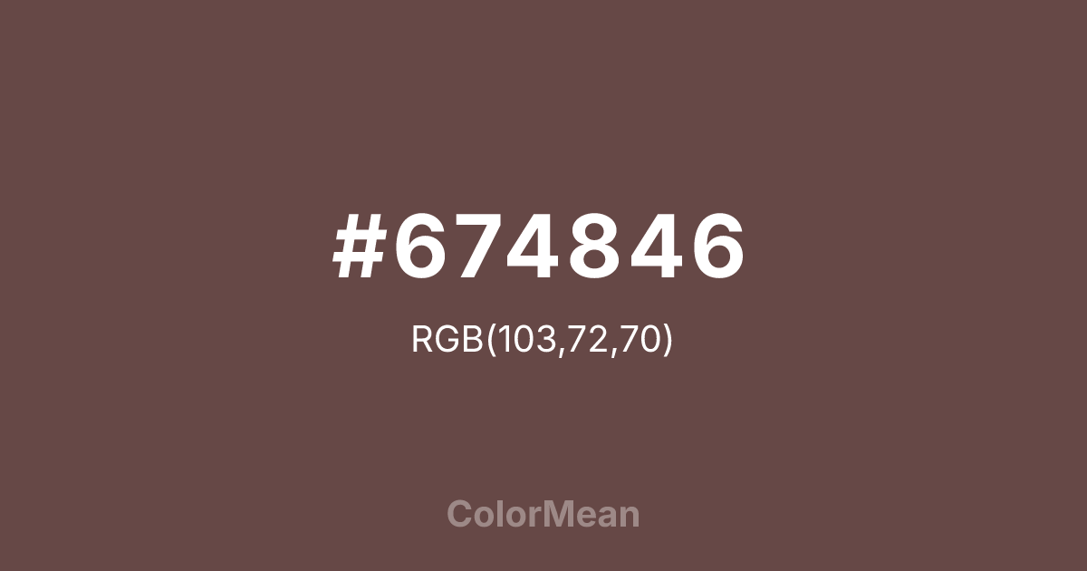Rose Ebony (#674846) RGB value is (103, 72, 70). The hex color red value is 103, green is 72, and blue is 70. Its HSL format shows a hue of 4°, saturation of 19%, and lightness of 34%. The CMYK process values are 0%, 30%, 32%, 60%.