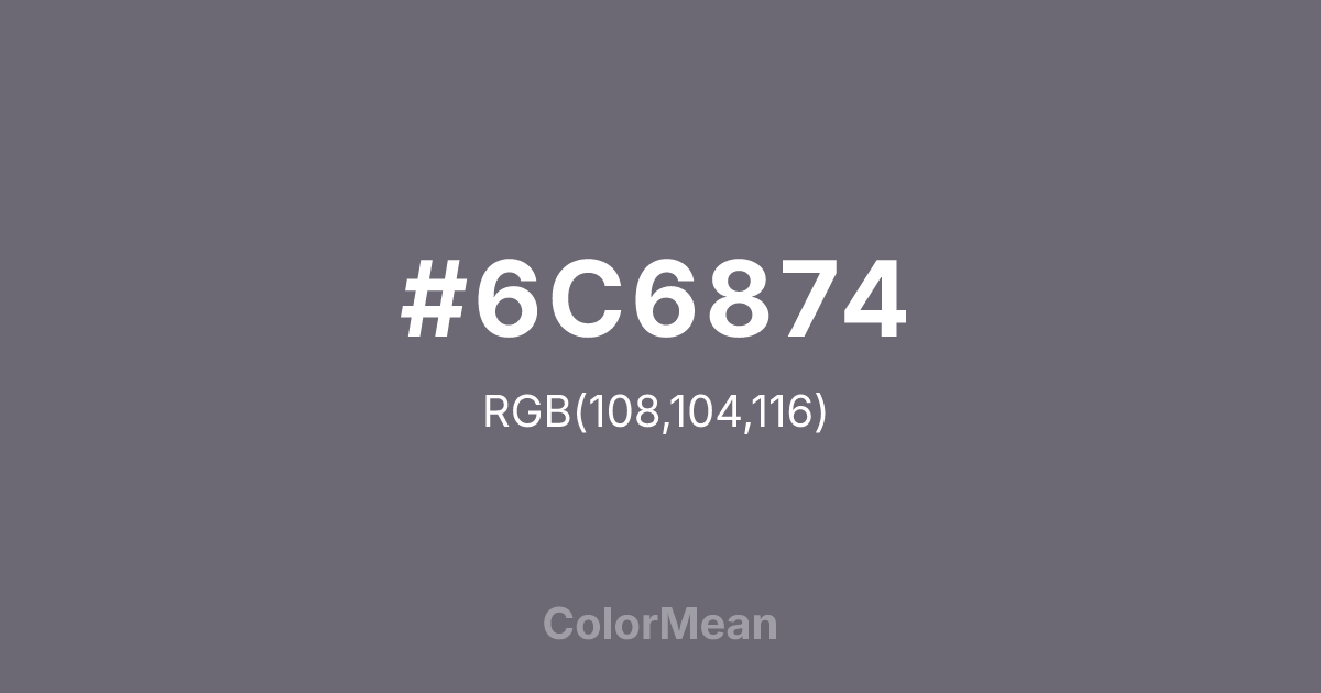 Pearl Blackberry (#6C6874) RGB value is (108, 104, 116). The hex color red value is 108, green is 104, and blue is 116. Its HSL format shows a hue of 260°, saturation of 5%, and lightness of 43%. The CMYK process values are 7%, 10%, 0%, 55%.