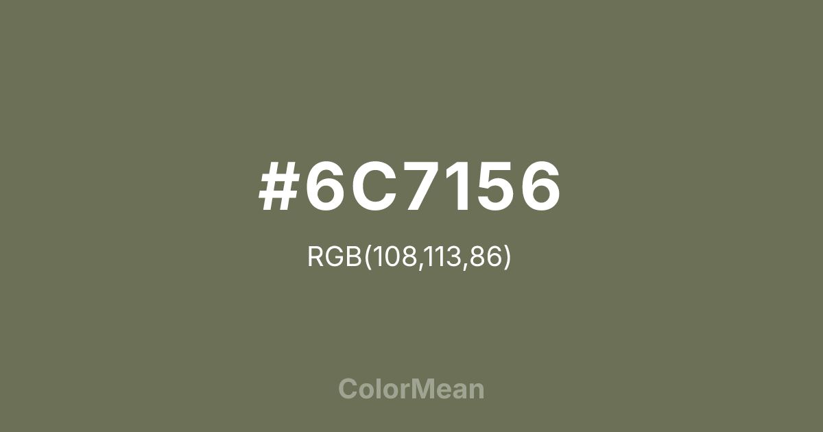 Convert Reed Green (#6C7156) across different color models and formats. These conversions help designers work seamlessly between digital and print media, ensuring this color maintains its intended appearance across RGB screens, CMYK printers, and HSL color manipulations.