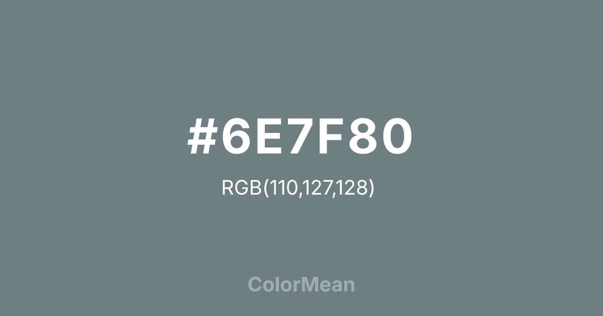 AuroMetalSaurus (#6E7F80) RGB value is (110, 127, 128). The hex color red value is 110, green is 127, and blue is 128. Its HSL format shows a hue of 183°, saturation of 8%, and lightness of 47%. The CMYK process values are 14%, 1%, 0%, 50%.