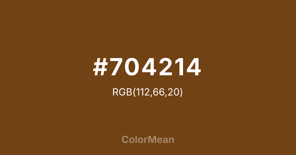 Sepia (#704214) RGB value is (112, 66, 20). The hex color red value is 112, green is 66, and blue is 20. Its HSL format shows a hue of 30°, saturation of 70%, and lightness of 26%. The CMYK process values are 0%, 41%, 82%, 56%.