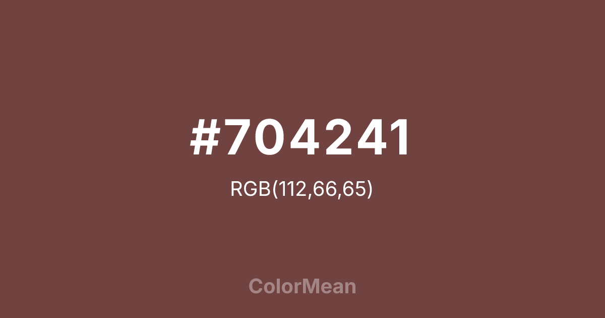 Roast Coffee (#704241) RGB value is (112, 66, 65). The hex color red value is 112, green is 66, and blue is 65. Its HSL format shows a hue of 1°, saturation of 27%, and lightness of 35%. The CMYK process values are 0%, 41%, 42%, 56%.