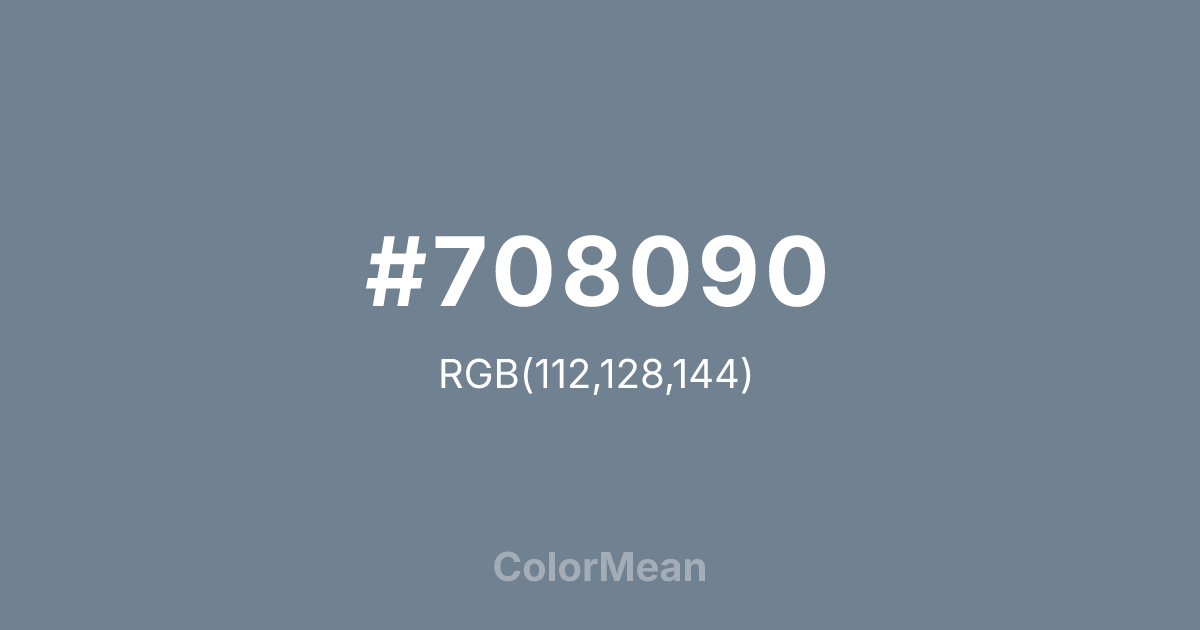 Slate Grey 708090 (#708090) RGB value is (112, 128, 144). The hex color red value is 112, green is 128, and blue is 144. Its HSL format shows a hue of 210°, saturation of 13%, and lightness of 50%. The CMYK process values are 22%, 11%, 0%, 44%.
