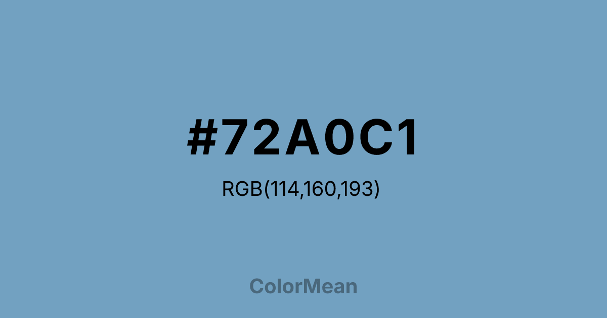 Air superiority Blue (#72A0C1) RGB value is (114, 160, 193). The hex color red value is 114, green is 160, and blue is 193. Its HSL format shows a hue of 205°, saturation of 39%, and lightness of 60%. The CMYK process values are 41%, 17%, 0%, 24%.