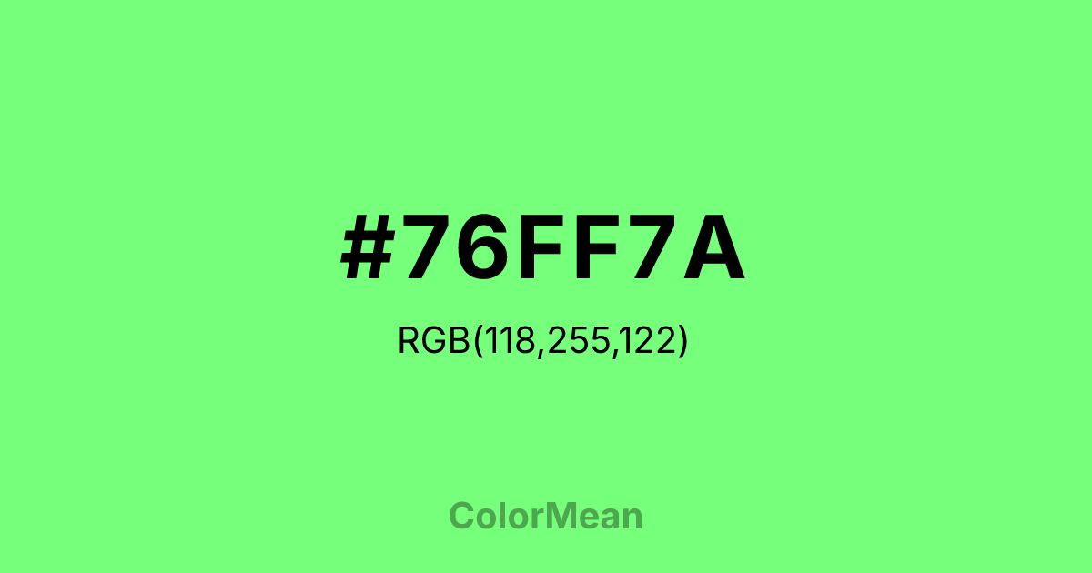 Screamin Green (#76FF7A) RGB value is (118, 255, 122). The hex color red value is 118, green is 255, and blue is 122. Its HSL format shows a hue of 122°, saturation of 100%, and lightness of 73%. The CMYK process values are 54%, 0%, 52%, 0%.