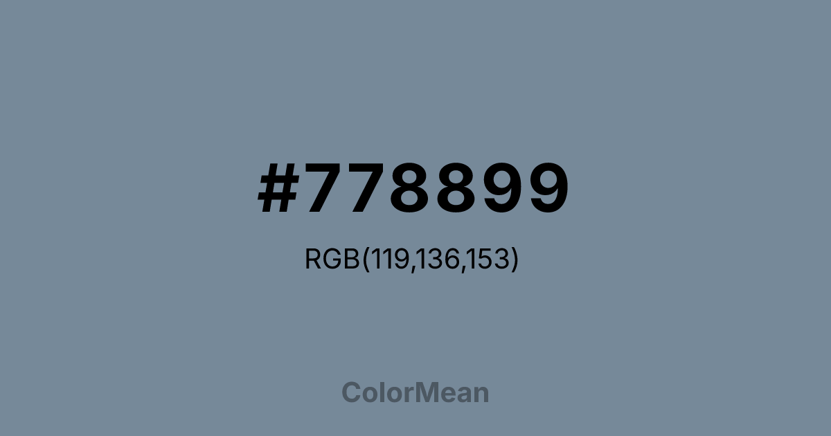 Lightslategray (#778899) RGB value is (119, 136, 153). The hex color red value is 119, green is 136, and blue is 153. Its HSL format shows a hue of 210°, saturation of 14%, and lightness of 53%. The CMYK process values are 22%, 11%, 0%, 40%.
