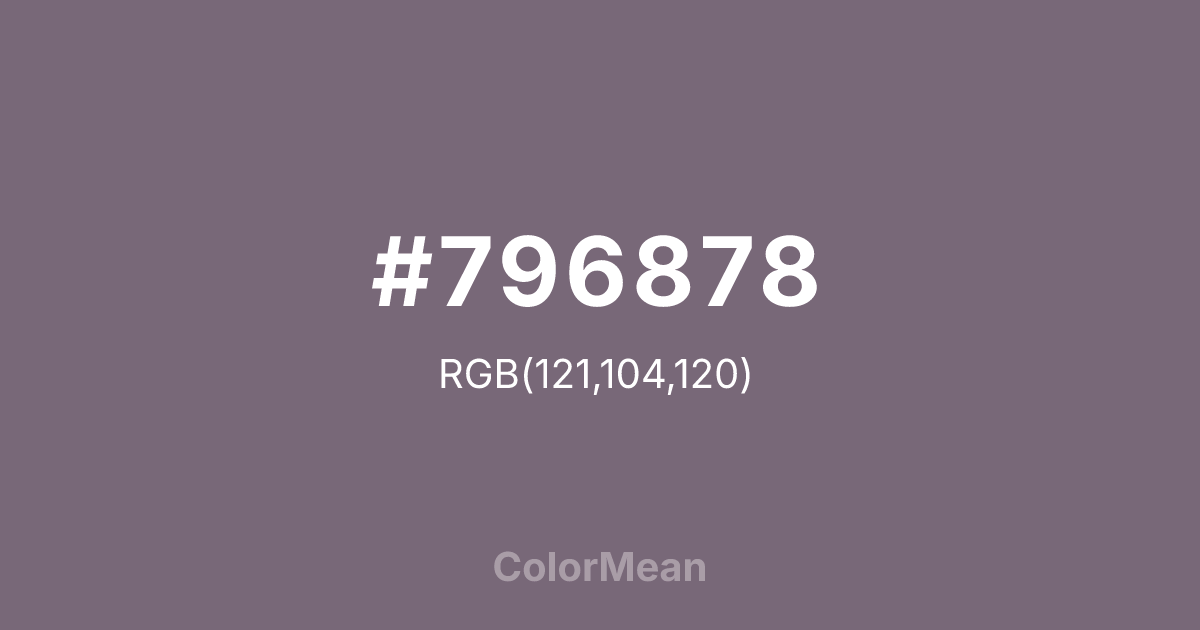 Old Lavender (#796878) RGB value is (121, 104, 120). The hex color red value is 121, green is 104, and blue is 120. Its HSL format shows a hue of 304°, saturation of 8%, and lightness of 44%. The CMYK process values are 0%, 14%, 1%, 53%.