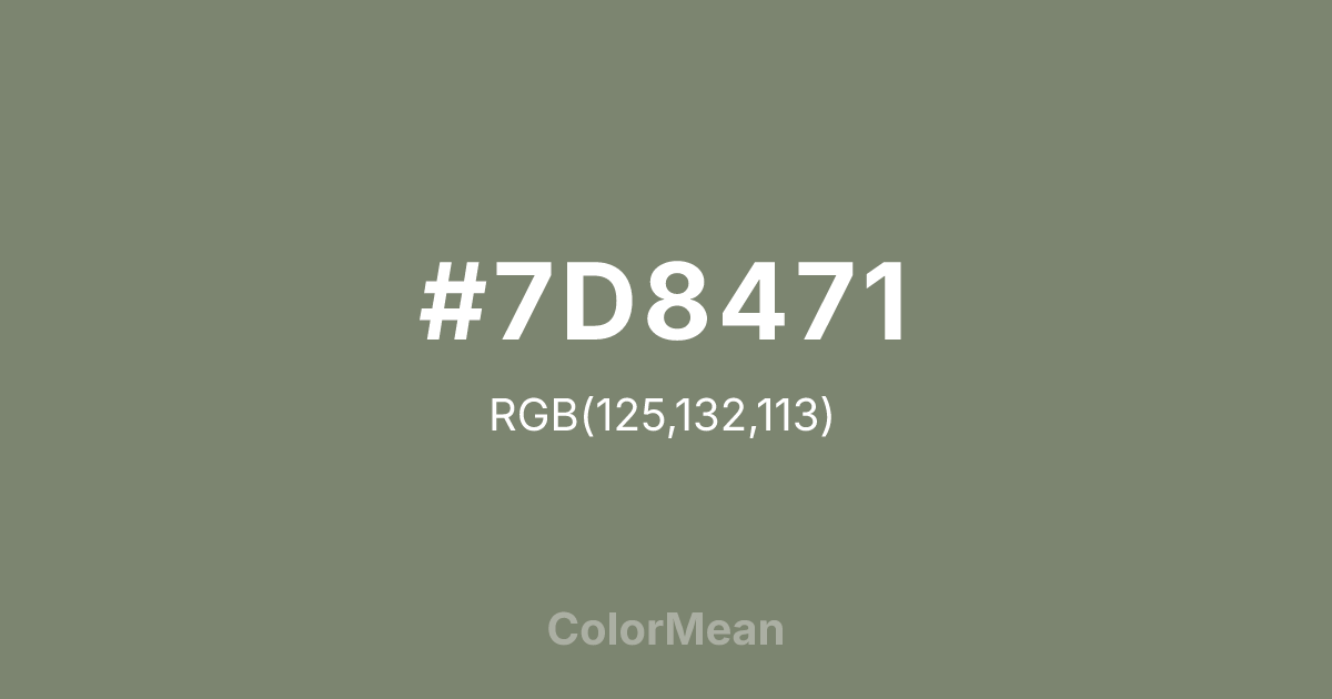 Cement Grey (#7D8471) RGB value is (125, 132, 113). The hex color red value is 125, green is 132, and blue is 113. Its HSL format shows a hue of 82°, saturation of 8%, and lightness of 48%. The CMYK process values are 5%, 0%, 14%, 48%.