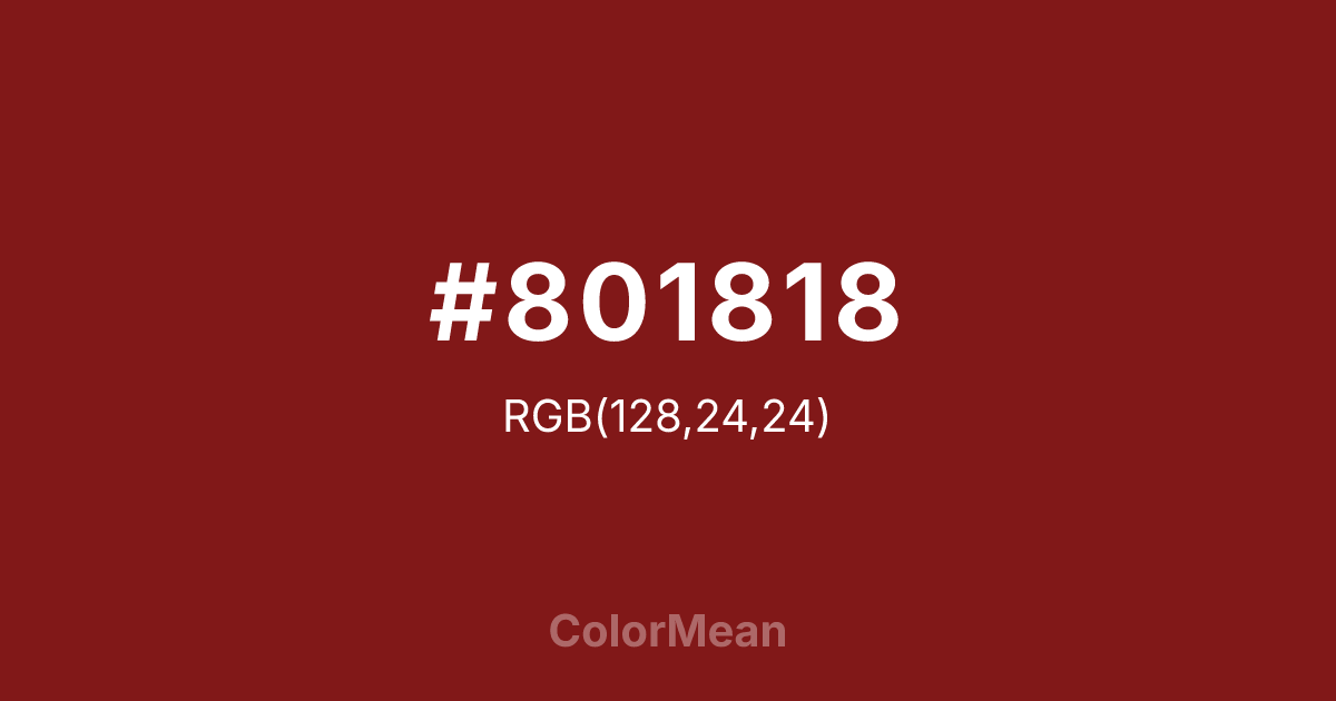 Falu Red (#801818) RGB value is (128, 24, 24). The hex color red value is 128, green is 24, and blue is 24. Its HSL format shows a hue of 0°, saturation of 68%, and lightness of 30%. The CMYK process values are 0%, 81%, 81%, 50%.