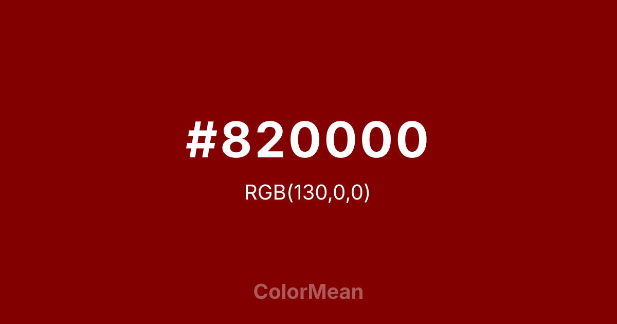 Deep Maroon (#820000) RGB value is (130, 0, 0). The hex color red value is 130, green is 0, and blue is 0. Its HSL format shows a hue of 0°, saturation of 100%, and lightness of 25%. The CMYK process values are 0%, 100%, 100%, 49%.