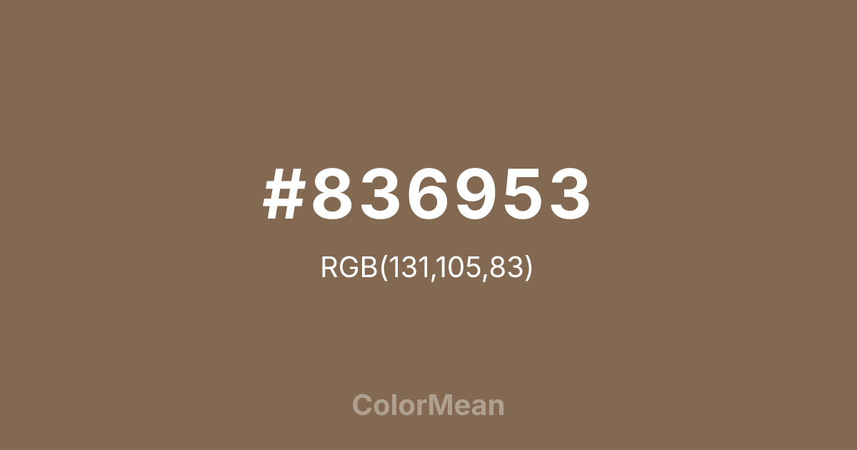 Pastel Brown (#836953) RGB value is (131, 105, 83). The hex color red value is 131, green is 105, and blue is 83. Its HSL format shows a hue of 27°, saturation of 22%, and lightness of 42%. The CMYK process values are 0%, 20%, 37%, 49%.