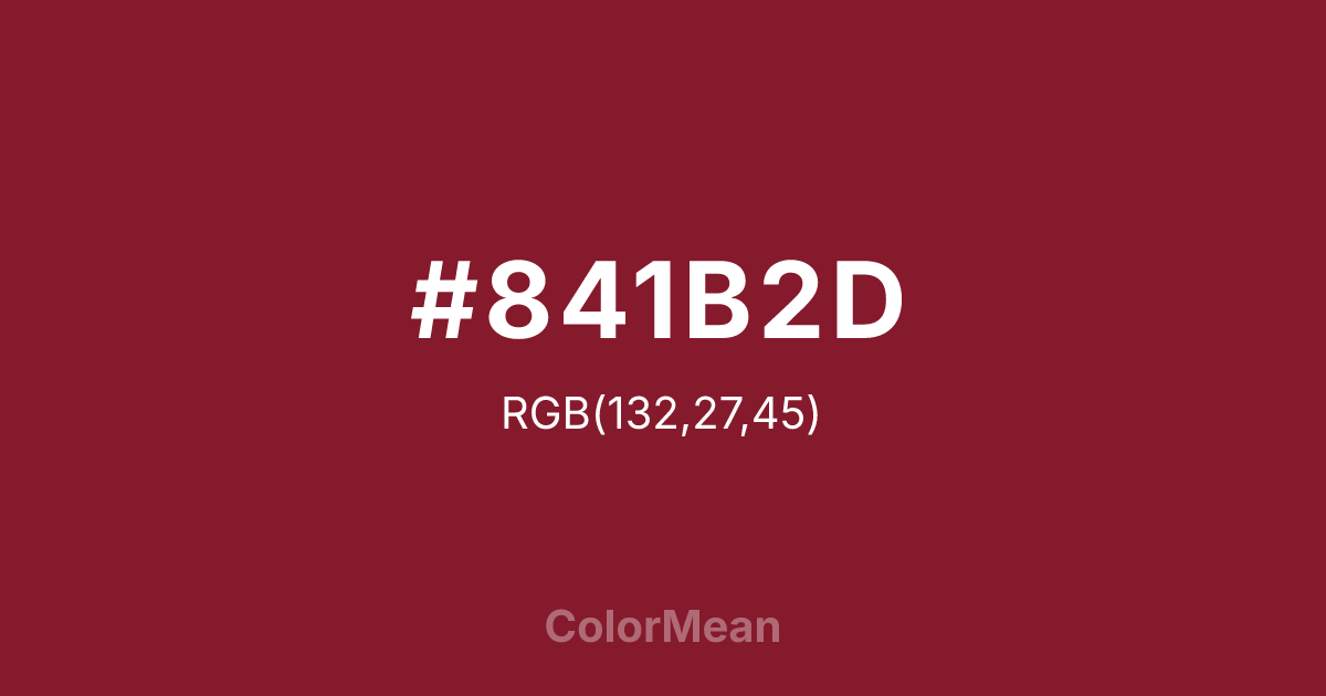 Antique ruby (#841B2D) RGB value is (132, 27, 45). The hex color red value is 132, green is 27, and blue is 45. Its HSL format shows a hue of 350°, saturation of 66%, and lightness of 31%. The CMYK process values are 0%, 80%, 66%, 48%.
