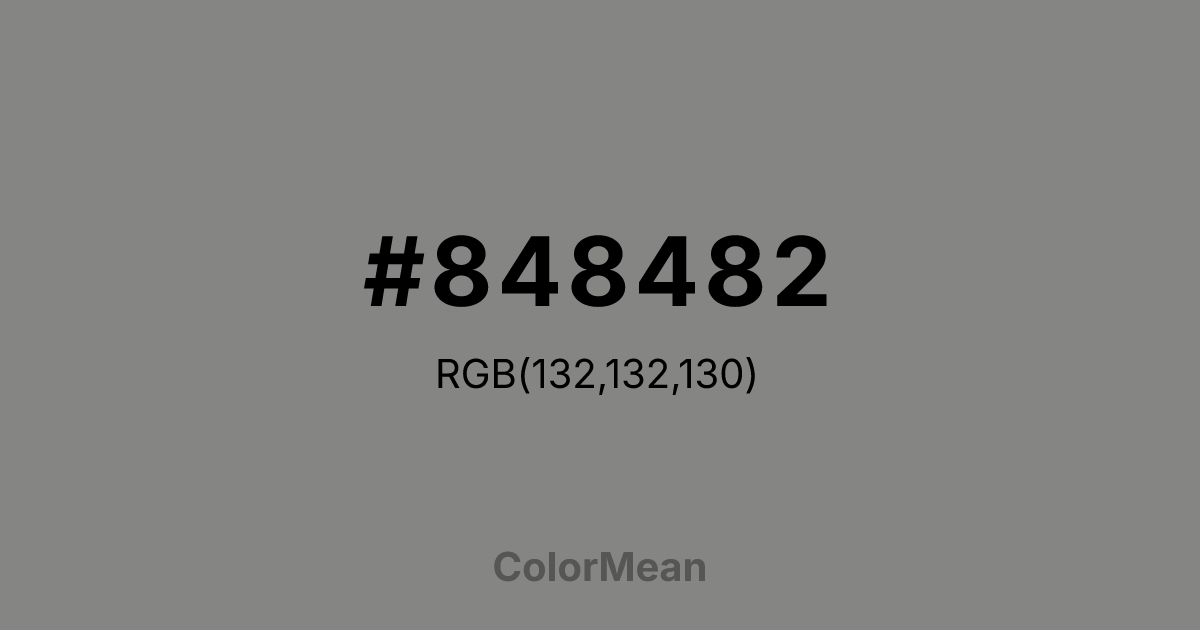 Old Silver (#848482) RGB value is (132, 132, 130). The hex color red value is 132, green is 132, and blue is 130. Its HSL format shows a hue of 60°, saturation of 1%, and lightness of 51%. The CMYK process values are 0%, 0%, 2%, 48%.