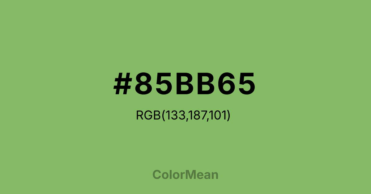 Dollar Bill (#85BB65) RGB value is (133, 187, 101). The hex color red value is 133, green is 187, and blue is 101. Its HSL format shows a hue of 98°, saturation of 39%, and lightness of 56%. The CMYK process values are 29%, 0%, 46%, 27%.