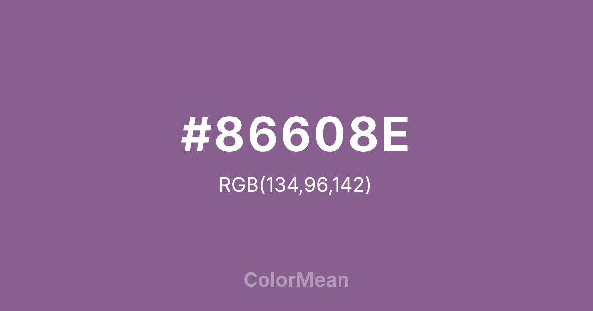 Pomp and Power (#86608E) RGB value is (134, 96, 142). The hex color red value is 134, green is 96, and blue is 142. Its HSL format shows a hue of 290°, saturation of 19%, and lightness of 47%. The CMYK process values are 6%, 32%, 0%, 44%.