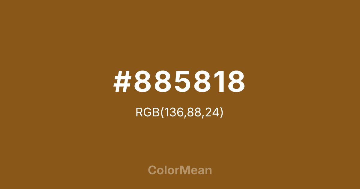 Grizzly (#885818) RGB value is (136, 88, 24). The hex color red value is 136, green is 88, and blue is 24. Its HSL format shows a hue of 34°, saturation of 70%, and lightness of 31%. The CMYK process values are 0%, 35%, 82%, 47%.