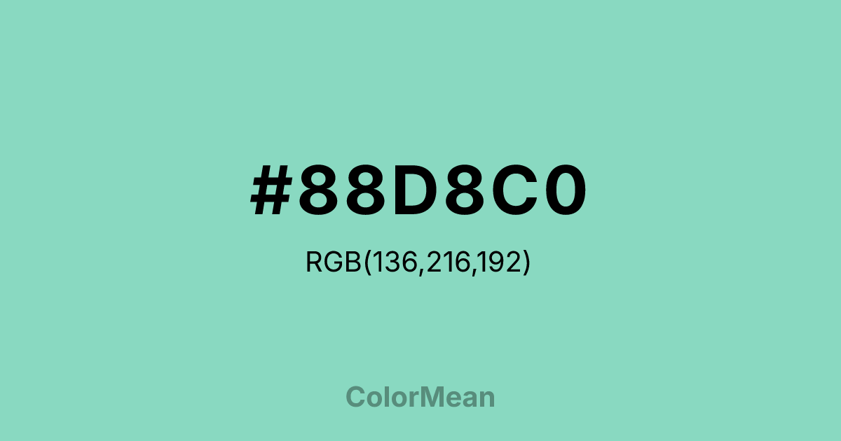 Pearl Aqua (#88D8C0) RGB value is (136, 216, 192). The hex color red value is 136, green is 216, and blue is 192. Its HSL format shows a hue of 162°, saturation of 51%, and lightness of 69%. The CMYK process values are 37%, 0%, 11%, 15%.
