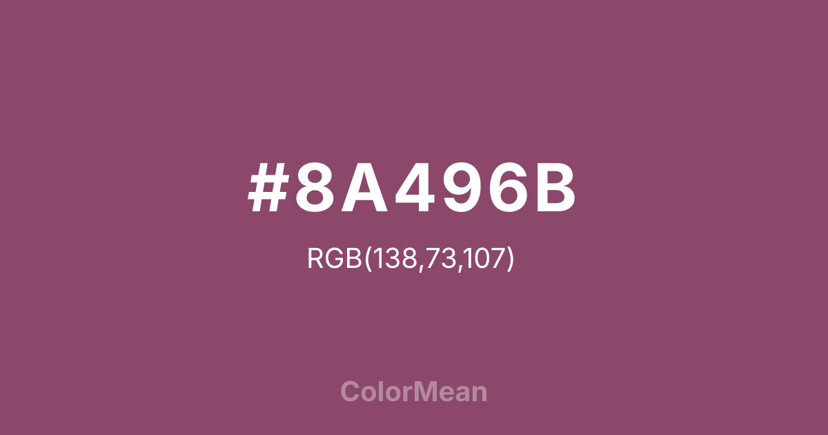 Twilight Lavender (#8A496B) RGB value is (138, 73, 107). The hex color red value is 138, green is 73, and blue is 107. Its HSL format shows a hue of 329°, saturation of 31%, and lightness of 41%. The CMYK process values are 0%, 47%, 22%, 46%.
