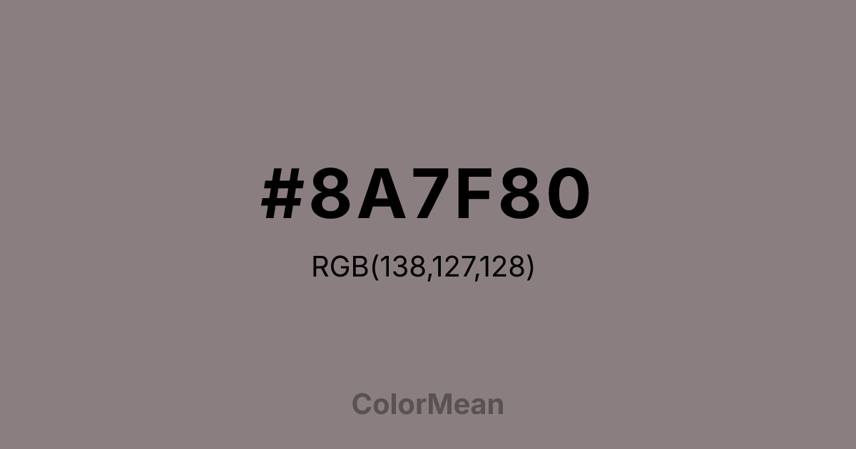 Rocket Metallic (#8A7F80) RGB value is (138, 127, 128). The hex color red value is 138, green is 127, and blue is 128. Its HSL format shows a hue of 355°, saturation of 4%, and lightness of 52%. The CMYK process values are 0%, 8%, 7%, 46%.