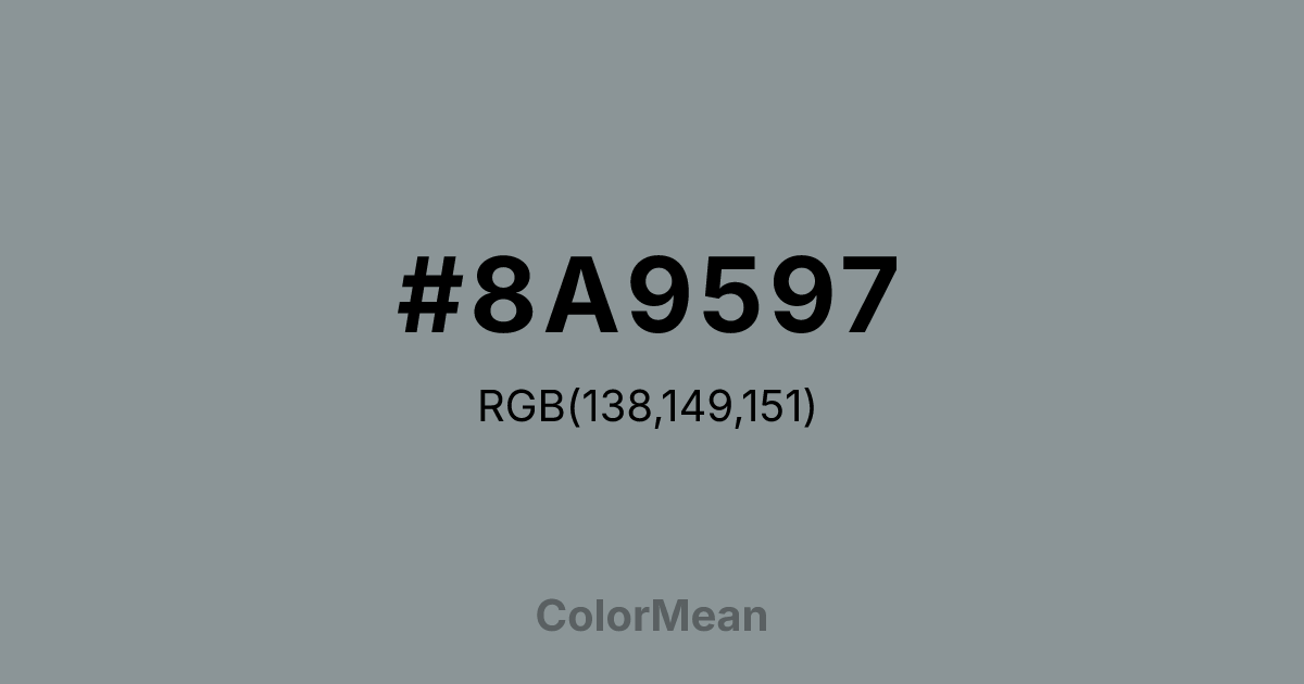 Silver Grey (#8A9597) RGB value is (138, 149, 151). The hex color red value is 138, green is 149, and blue is 151. Its HSL format shows a hue of 189°, saturation of 6%, and lightness of 57%. The CMYK process values are 9%, 1%, 0%, 41%.