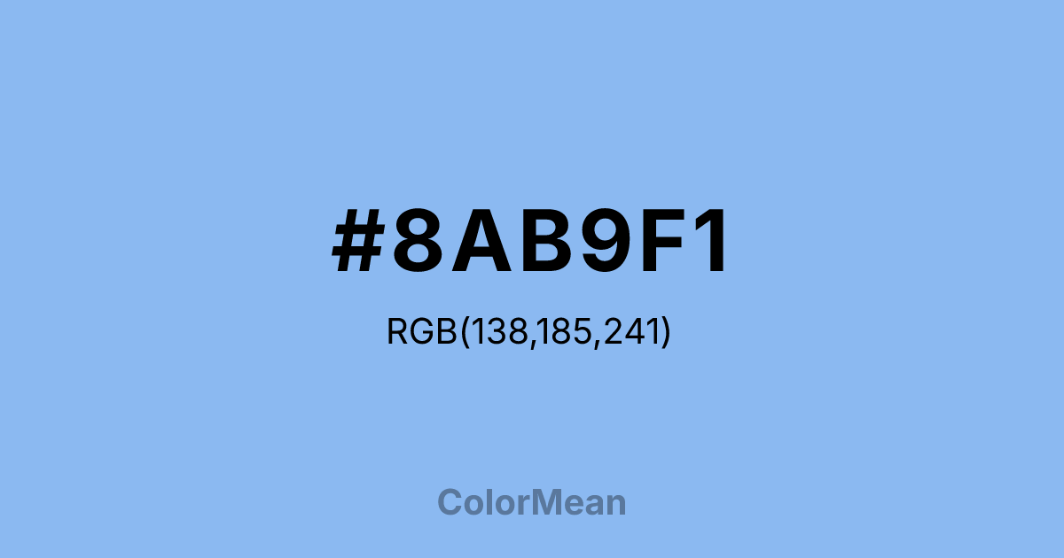 Jordy Blue (#8AB9F1) RGB value is (138, 185, 241). The hex color red value is 138, green is 185, and blue is 241. Its HSL format shows a hue of 213°, saturation of 79%, and lightness of 74%. The CMYK process values are 43%, 23%, 0%, 5%.