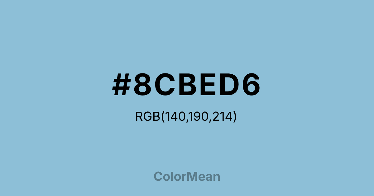 Dark Sky Blue (#8CBED6) RGB value is (140, 190, 214). The hex color red value is 140, green is 190, and blue is 214. Its HSL format shows a hue of 199°, saturation of 47%, and lightness of 69%. The CMYK process values are 35%, 11%, 0%, 16%.
