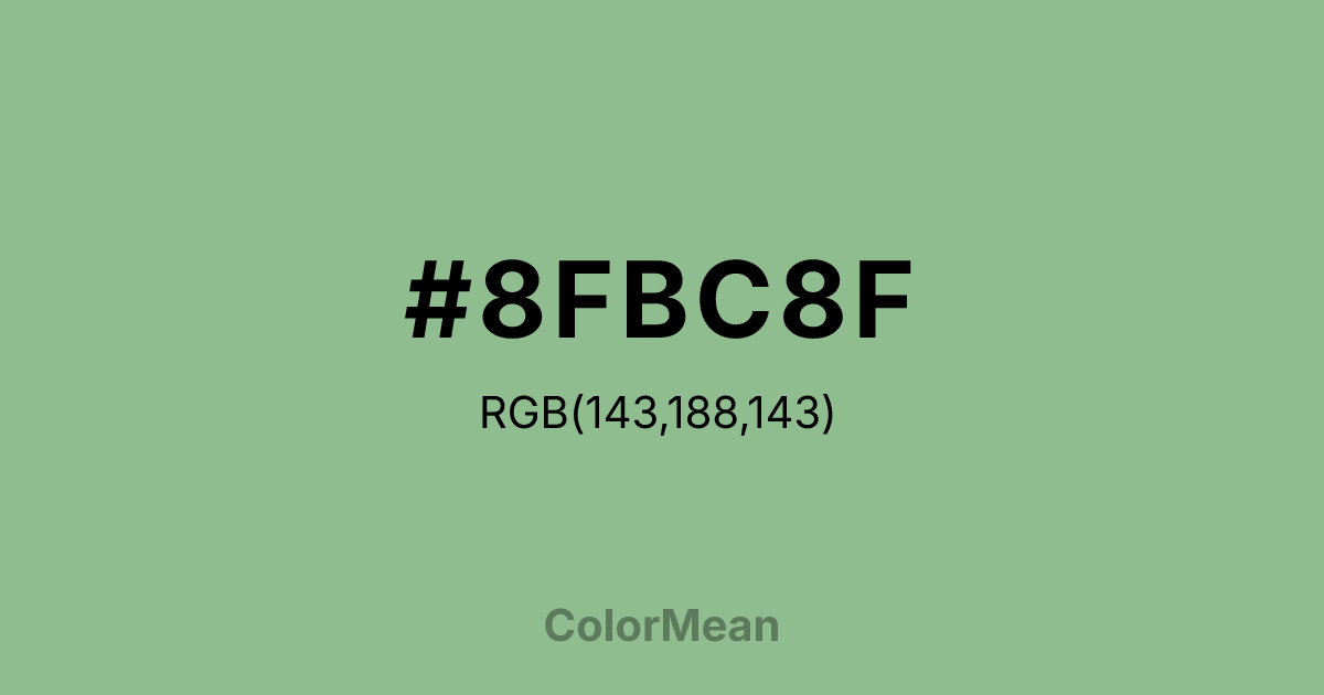 DarkseaGreen (#8FBC8F) RGB value is (143, 188, 143). The hex color red value is 143, green is 188, and blue is 143. Its HSL format shows a hue of 120°, saturation of 25%, and lightness of 65%. The CMYK process values are 24%, 0%, 24%, 26%.