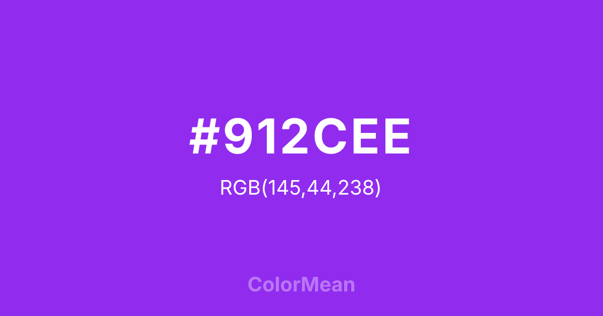 Purple2 (#912CEE) RGB value is (145, 44, 238). The hex color red value is 145, green is 44, and blue is 238. Its HSL format shows a hue of 271°, saturation of 85%, and lightness of 55%. The CMYK process values are 39%, 82%, 0%, 7%.