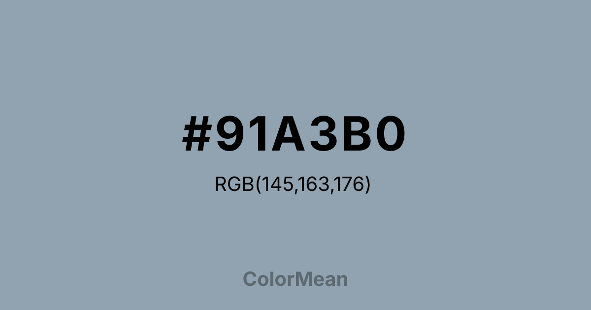 Cadet Grey (#91A3B0) RGB value is (145, 163, 176). The hex color red value is 145, green is 163, and blue is 176. Its HSL format shows a hue of 205°, saturation of 16%, and lightness of 63%. The CMYK process values are 18%, 7%, 0%, 31%.