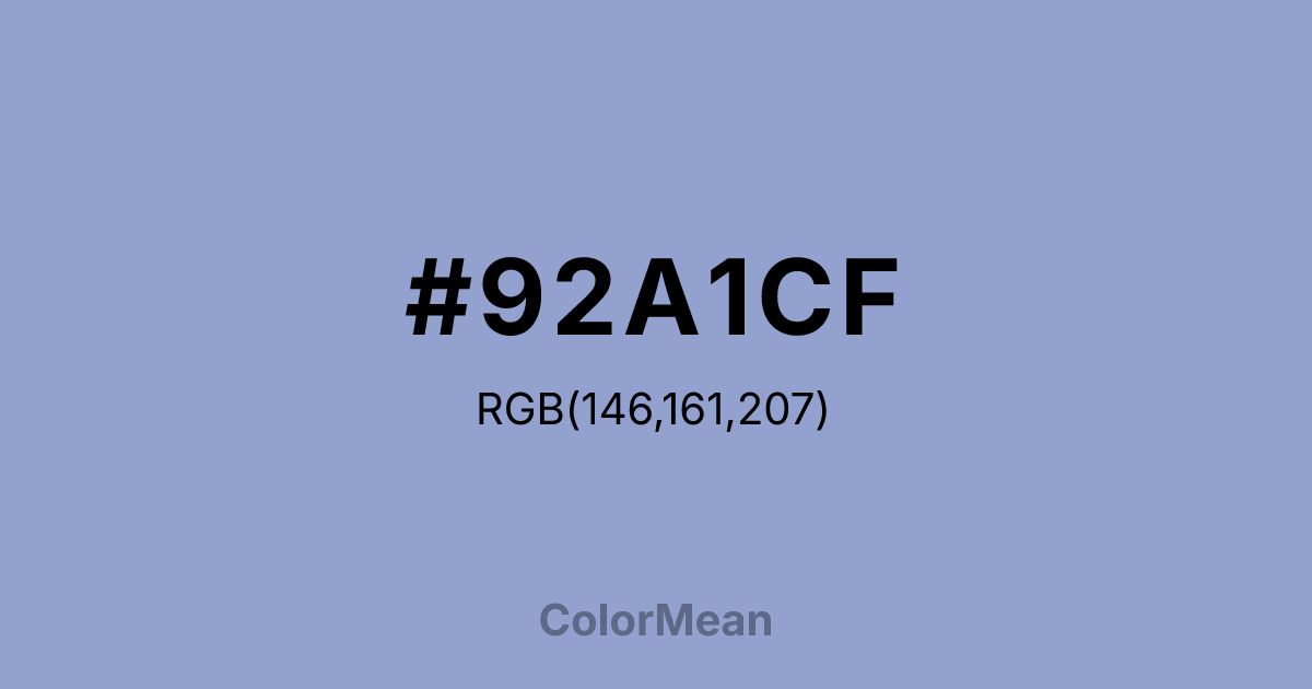 Ceil (#92A1CF) RGB value is (146, 161, 207). The hex color red value is 146, green is 161, and blue is 207. Its HSL format shows a hue of 225°, saturation of 39%, and lightness of 69%. The CMYK process values are 29%, 22%, 0%, 19%.