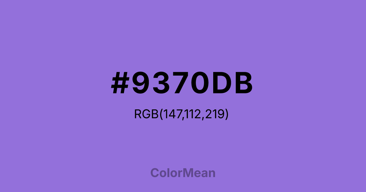 MediumPurple (#9370DB) RGB value is (147, 112, 219). The hex color red value is 147, green is 112, and blue is 219. Its HSL format shows a hue of 260°, saturation of 60%, and lightness of 65%. The CMYK process values are 33%, 49%, 0%, 14%.