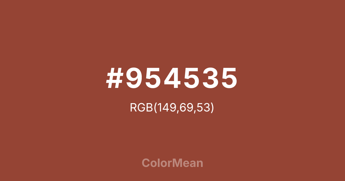 Chestnut (#954535) RGB value is (149, 69, 53). The hex color red value is 149, green is 69, and blue is 53. Its HSL format shows a hue of 10°, saturation of 48%, and lightness of 40%. The CMYK process values are 0%, 54%, 64%, 42%.
