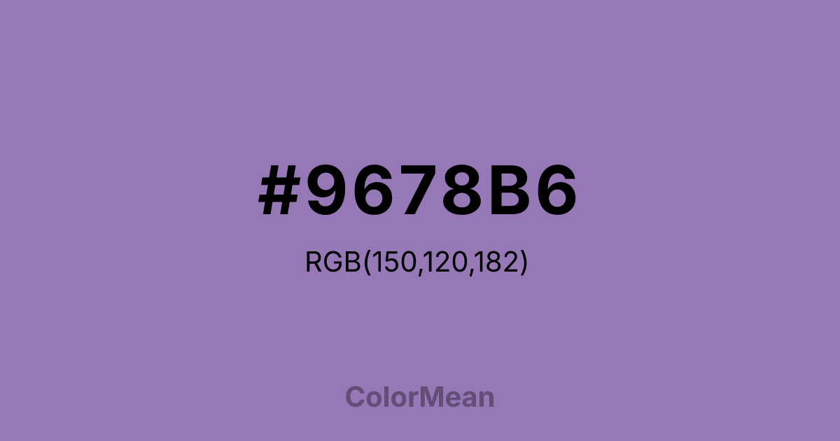 Purple Mountain Majesty (#9678B6) RGB value is (150, 120, 182). The hex color red value is 150, green is 120, and blue is 182. Its HSL format shows a hue of 269°, saturation of 30%, and lightness of 59%. The CMYK process values are 18%, 34%, 0%, 29%.