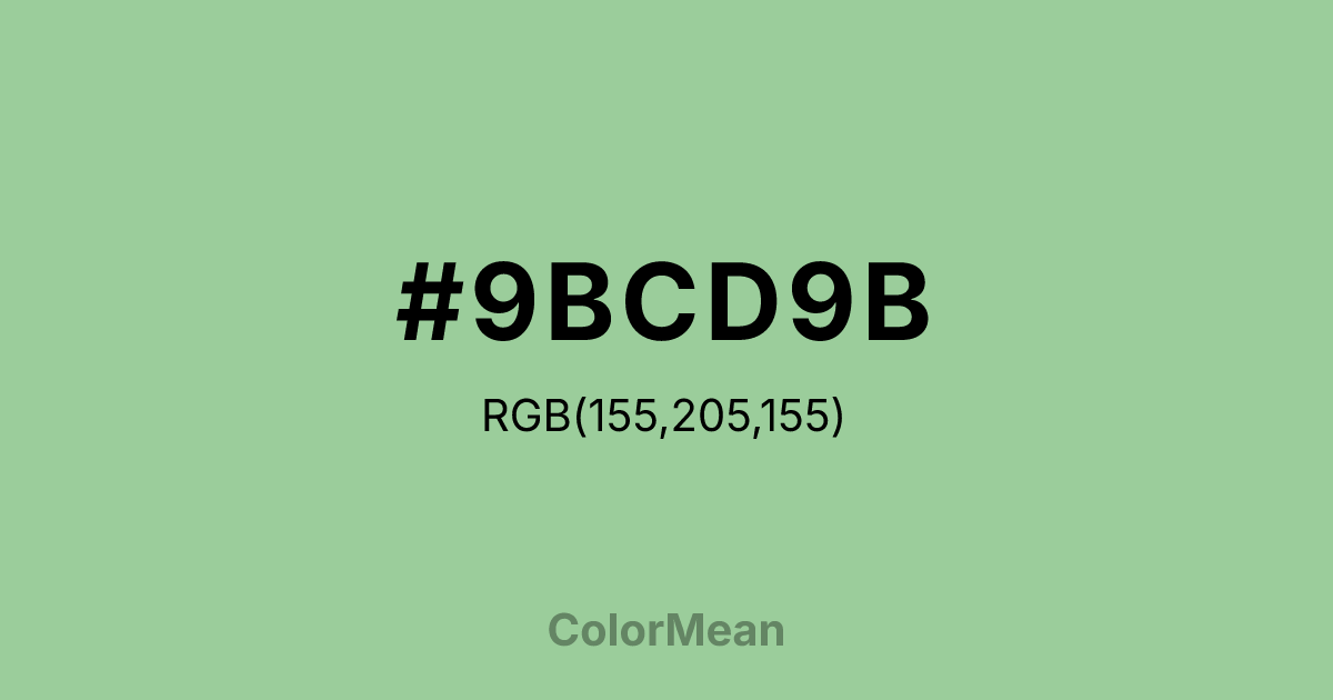 DarkSeaGreen3 (#9BCD9B) RGB value is (155, 205, 155). The hex color red value is 155, green is 205, and blue is 155. Its HSL format shows a hue of 120°, saturation of 33%, and lightness of 71%. The CMYK process values are 24%, 0%, 24%, 20%.