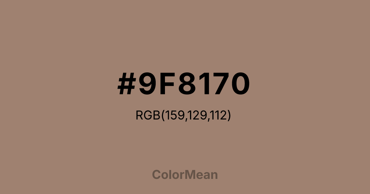 Beaver (#9F8170) RGB value is (159, 129, 112). The hex color red value is 159, green is 129, and blue is 112. Its HSL format shows a hue of 22°, saturation of 20%, and lightness of 53%. The CMYK process values are 0%, 19%, 30%, 38%.