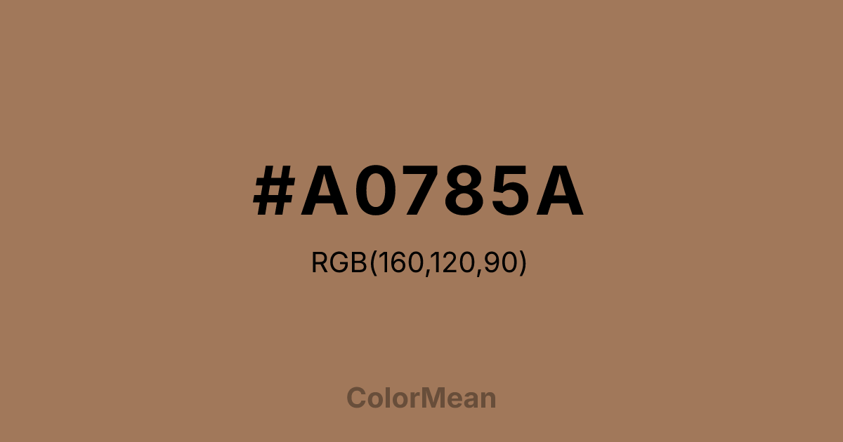 Chamoisee (#A0785A) RGB value is (160, 120, 90). The hex color red value is 160, green is 120, and blue is 90. Its HSL format shows a hue of 26°, saturation of 28%, and lightness of 49%. The CMYK process values are 0%, 25%, 44%, 37%.