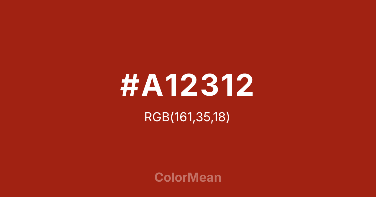 Tomato Red (#A12312) RGB value is (161, 35, 18). The hex color red value is 161, green is 35, and blue is 18. Its HSL format shows a hue of 7°, saturation of 80%, and lightness of 35%. The CMYK process values are 0%, 78%, 89%, 37%.