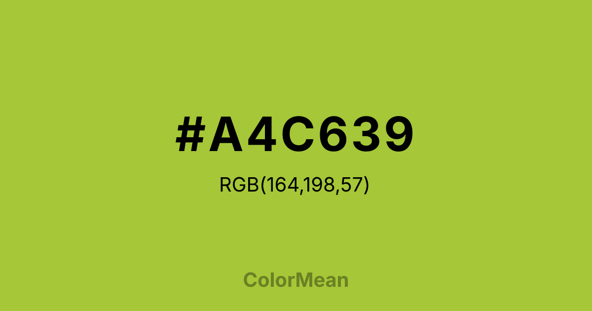 Android Green (#A4C639) RGB value is (164, 198, 57). The hex color red value is 164, green is 198, and blue is 57. Its HSL format shows a hue of 74°, saturation of 55%, and lightness of 50%. The CMYK process values are 17%, 0%, 71%, 22%.