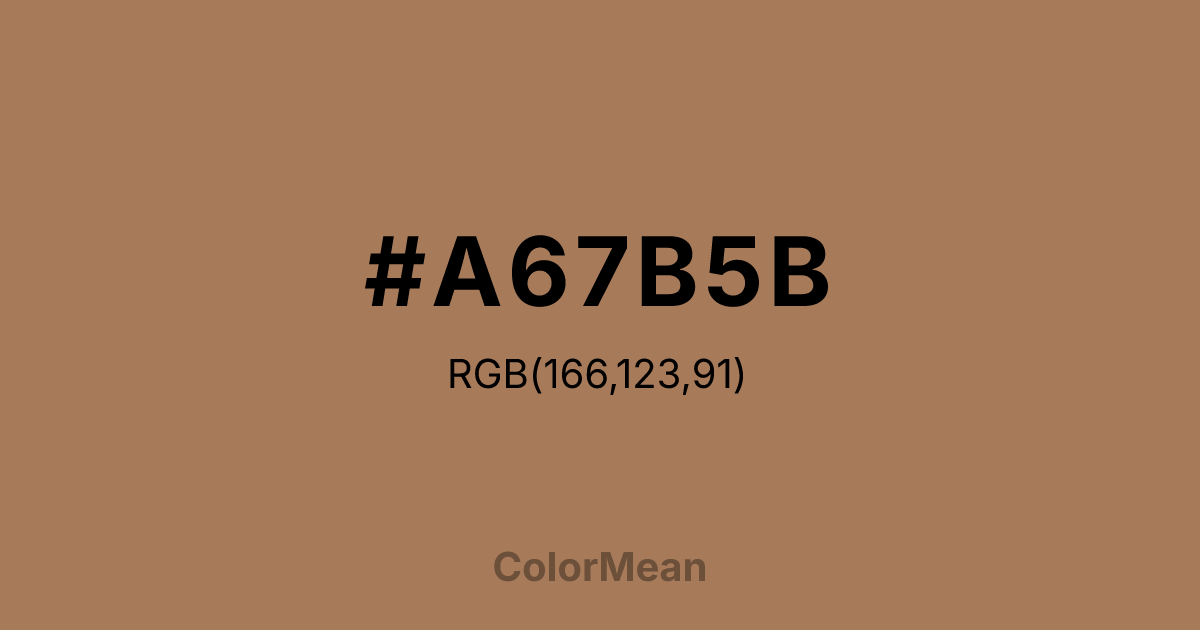 Tuscan Tan (#A67B5B) RGB value is (166, 123, 91). The hex color red value is 166, green is 123, and blue is 91. Its HSL format shows a hue of 26°, saturation of 30%, and lightness of 50%. The CMYK process values are 0%, 26%, 45%, 35%.