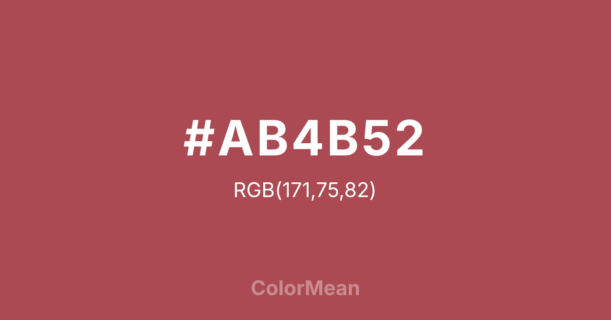 English Red (#AB4B52) RGB value is (171, 75, 82). The hex color red value is 171, green is 75, and blue is 82. Its HSL format shows a hue of 356°, saturation of 39%, and lightness of 48%. The CMYK process values are 0%, 56%, 52%, 33%.