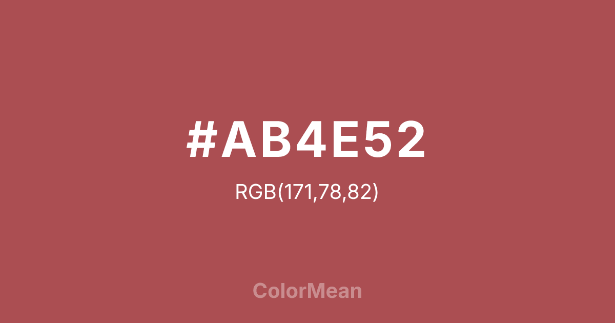 Rose Vale (#AB4E52) RGB value is (171, 78, 82). The hex color red value is 171, green is 78, and blue is 82. Its HSL format shows a hue of 357°, saturation of 37%, and lightness of 49%. The CMYK process values are 0%, 54%, 52%, 33%.