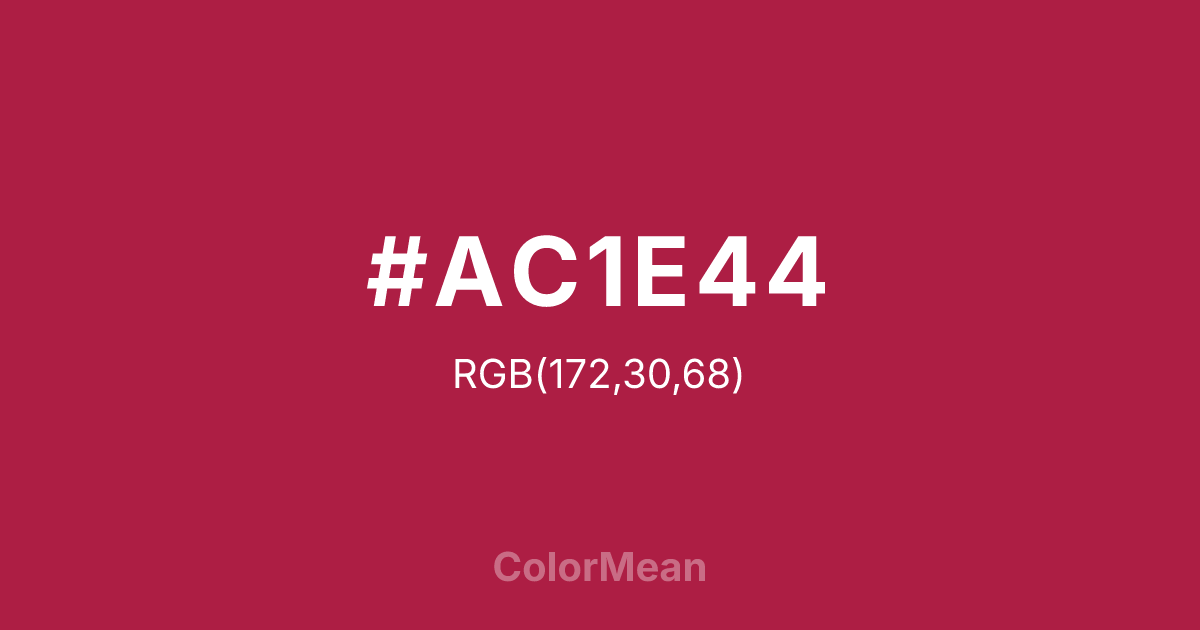 French Wine (#AC1E44) RGB value is (172, 30, 68). The hex color red value is 172, green is 30, and blue is 68. Its HSL format shows a hue of 344°, saturation of 70%, and lightness of 40%. The CMYK process values are 0%, 83%, 60%, 33%.