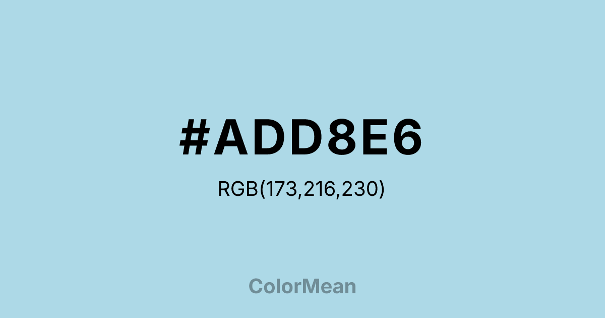 LightBlue (#ADD8E6) RGB value is (173, 216, 230). The hex color red value is 173, green is 216, and blue is 230. Its HSL format shows a hue of 195°, saturation of 53%, and lightness of 79%. The CMYK process values are 25%, 6%, 0%, 10%.