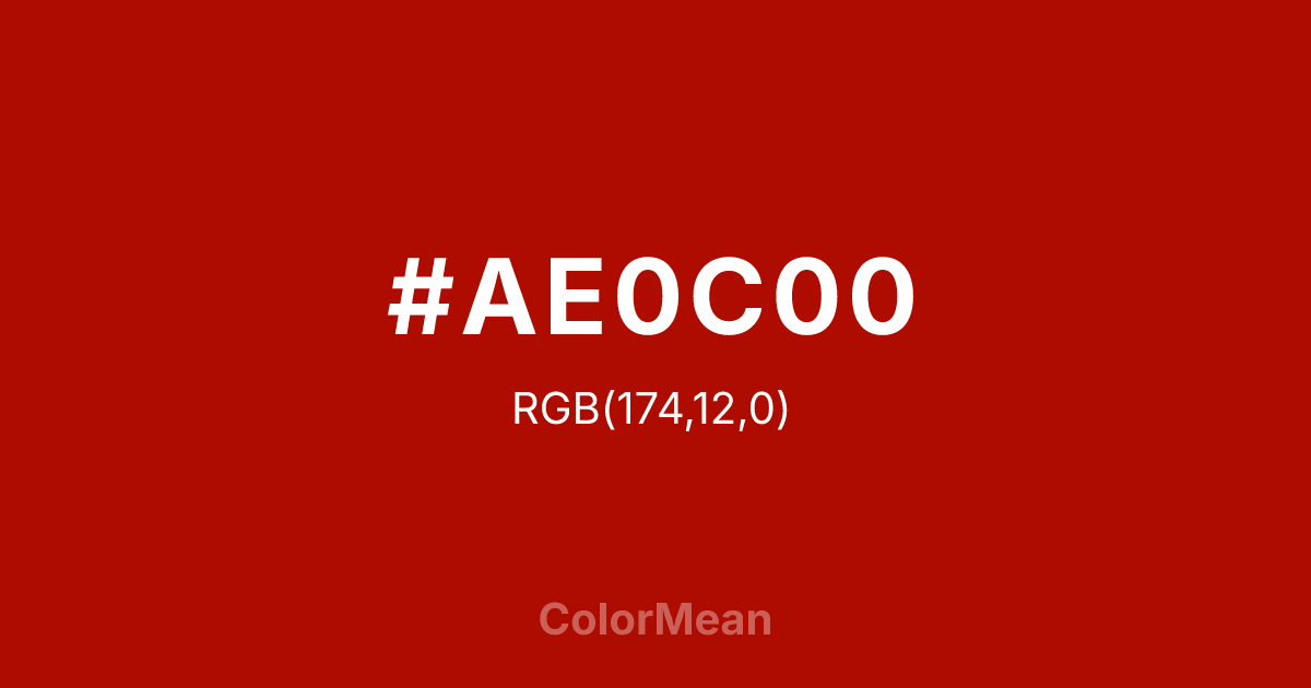 Mordant Red 19 (#AE0C00) RGB value is (174, 12, 0). The hex color red value is 174, green is 12, and blue is 0. Its HSL format shows a hue of 4°, saturation of 100%, and lightness of 34%. The CMYK process values are 0%, 93%, 100%, 32%.