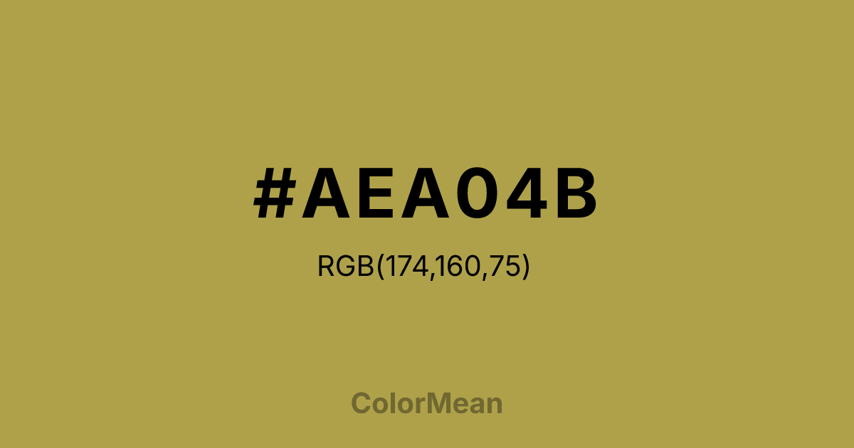 Ochre Yellow (#AEA04B) RGB value is (174, 160, 75). The hex color red value is 174, green is 160, and blue is 75. Its HSL format shows a hue of 52°, saturation of 40%, and lightness of 49%. The CMYK process values are 0%, 8%, 57%, 32%.