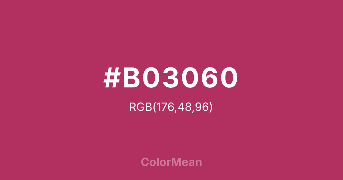 Rich Maroon (#B03060) RGB value is (176, 48, 96). The hex color red value is 176, green is 48, and blue is 96. Its HSL format shows a hue of 338°, saturation of 57%, and lightness of 44%. The CMYK process values are 0%, 73%, 45%, 31%.
