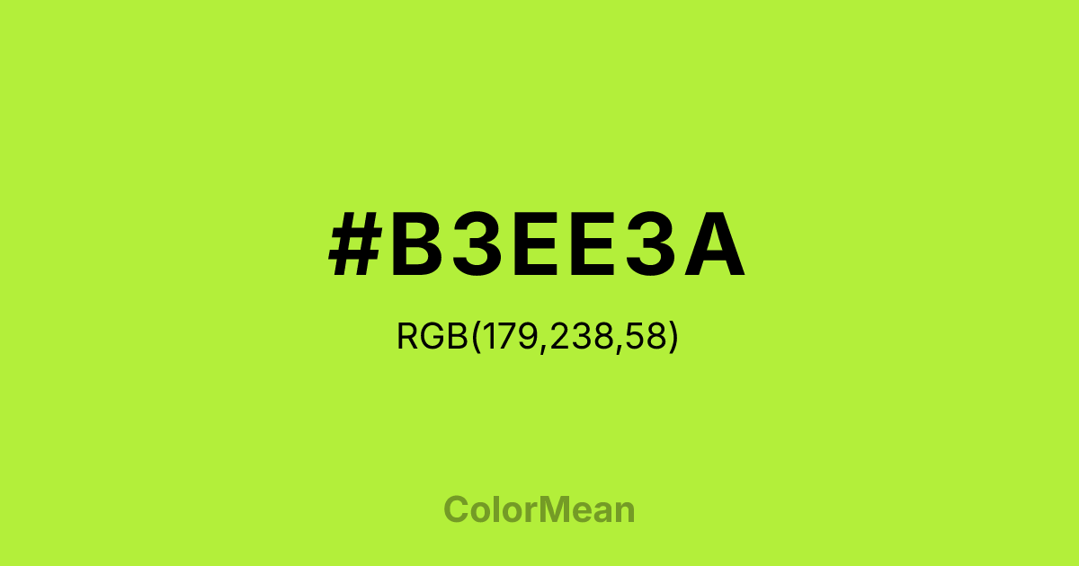 OliveDrab2 (#B3EE3A) RGB value is (179, 238, 58). The hex color red value is 179, green is 238, and blue is 58. Its HSL format shows a hue of 80°, saturation of 84%, and lightness of 58%. The CMYK process values are 25%, 0%, 76%, 7%.