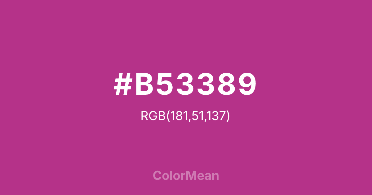 Fandango (#B53389) RGB value is (181, 51, 137). The hex color red value is 181, green is 51, and blue is 137. Its HSL format shows a hue of 320°, saturation of 56%, and lightness of 45%. The CMYK process values are 0%, 72%, 24%, 29%.